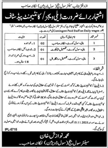 Applications must be submitted during office hours at the Office of the Senior Civil Judge (Civil Division), Nankana Sahib, no later than November 10, 2025.