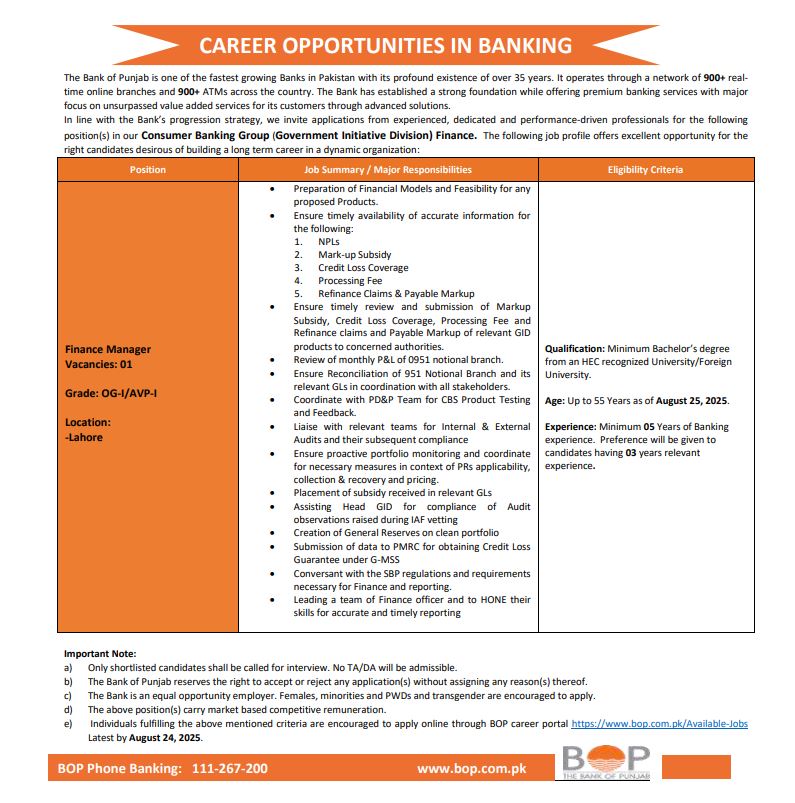 - Individuals fulfilling the above criteria are encouraged to apply online through the BOP career portal: https://www.bop.com.pk/Available-Jobs .Latest by: August 24, 2025.