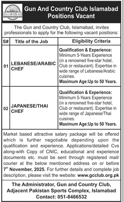 The Gun and Country Club Islamabad has announced exciting new job opportunities in October 2025, inviting skilled culinary professionals to join their prestigious hospitality team. According to the official advertisement, the club is seeking experienced Lebanese/Arabic Chef and Japanese/Thai Chef with a proven record of working in five-star hotels, restaurants, or elite clubs. Candidates with expertise in authentic cuisines and at least five years of professional experience are encouraged to apply. The club offers a market-based, attractive, and negotiable salary package based on qualifications and experience. Applications must be submitted via courier or registered mail before 7 November 2025.