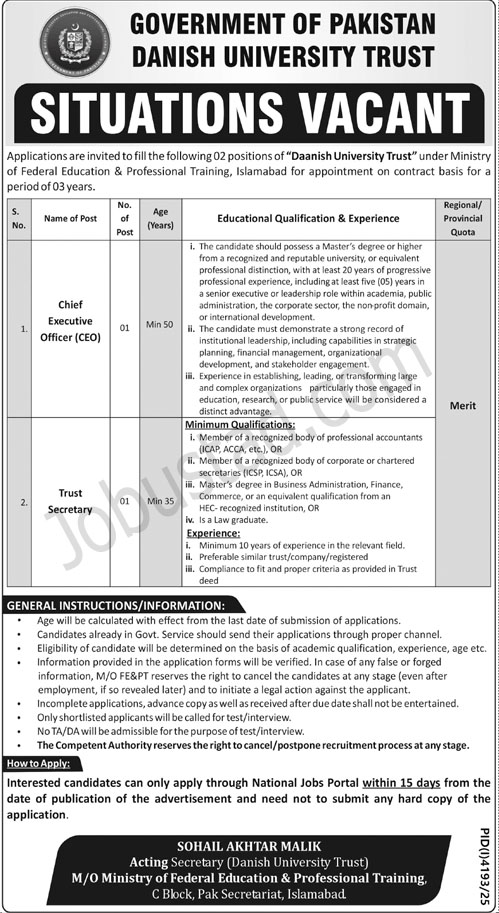 The Ministry of Federal Education and Professional Training has officially released its Vacancies Announcement November 2025 under the Daanish University Trust, inviting qualified and experienced professionals to apply for two key positions on a 3-year contract. This latest recruitment drive aims to bring forward dynamic individuals capable of leading, managing, and transforming institutional operations with excellence. Eligible candidates can apply online through the National Jobs Portal within 15 days of the advertisement’s publication.