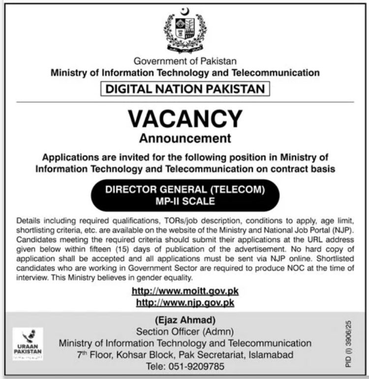 The Ministry of Information Technology and Telecommunication (MOITT), Government of Pakistan, has issued its Vacancy Announcement November 2025 Advertisement inviting applications from qualified and experienced professionals for the prestigious post of Director General (Telecom) under the MP-II Scale. This opportunity is part of the government’s Digital Nation Pakistan initiative, aiming to strengthen the country’s telecom infrastructure and policy framework. The position is offered on a contract basis, and applications are to be submitted online only through the National Job Portal (NJP). Candidates currently serving in the public sector must present a No Objection Certificate (NOC) at the time of the interview. The Ministry ensures merit-based recruitment and strongly upholds gender equality in its hiring process