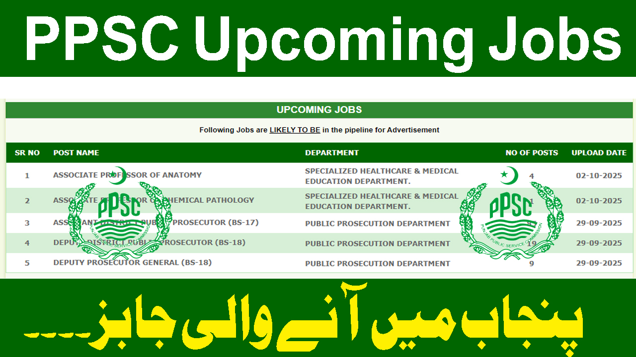 PPSC Schedule the Upcoming Vacancies in Punjab October 2025 Punjab Public Service Commission Announce the List of upcoming Vacancies.Following Departments Specialized Healthcare & Medical Education Department.Specialized Healthcare & Medical Education Department.Public Prosecution Department,Public Prosecution Department,Public Prosecution Departmen will Hire the Staff from all Punjab Districts