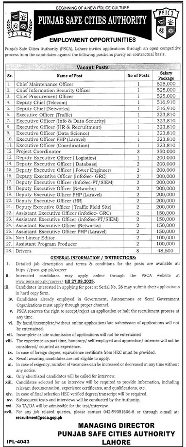 The Punjab Safe Cities Authority (PSCA) has announced multiple high-paying job opportunities for August 2025 in Lahore under its mission to modernize policing and improve public safety through advanced technology. Offering lucrative salaries and a range of positions from senior management to technical experts and operational staff, the Punjab Safe Cities Authority PSCA Jobs August 2025 Advertisement invites skilled, motivated, and qualified candidates to join the team on a contractual basis. These roles offer a chance to contribute to a safer, smarter Punjab through innovation, technology, and strategic planning.