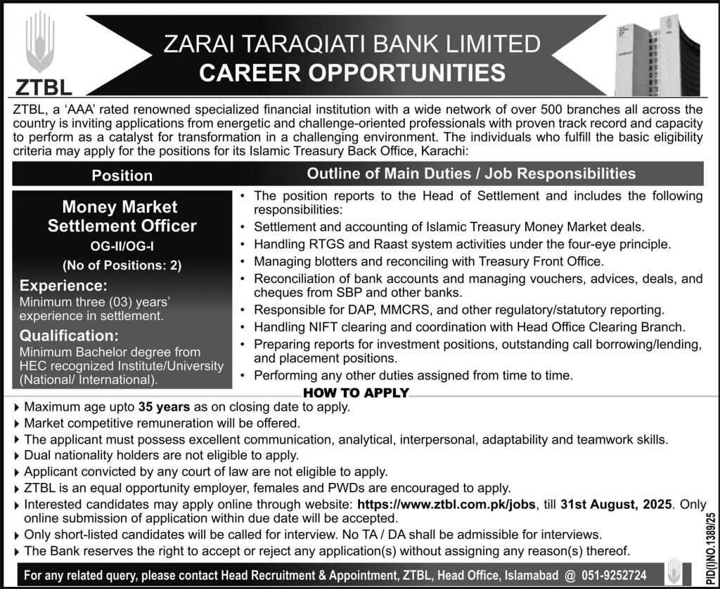 Zarai Taraqiati Bank Limited (ZTBL), a AAA-rated specialized financial institution with a nationwide branch network, has announced its ZTBL Jobs in Karachi August 2025 Advertisement. The bank is inviting applications from energetic and challenge-oriented professionals for its Islamic Treasury Back Office in Karachi. This is an excellent opportunity for candidates with relevant qualifications and settlement experience to join ZTBL as Money Market Settlement Officer (OG-II/OG-I). The positions offer market competitive remuneration, professional growth, and a dynamic working environment.